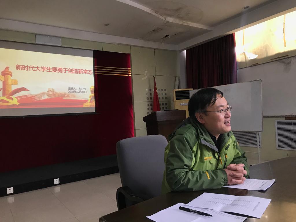 院长报告会在学院337会议室举行。院长杜伟以《新时代大学生要勇于创造新常态》为题作专场报告。学院团委老师、全体党员、入党积极分子代表、研究生代表参加学习。
