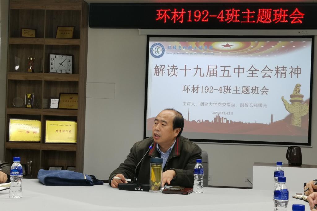 郝曙光副校长就党的十九届五中全会精神深度解读与新时代大学生如何安排好大学生活等问题展开重要讲话。他首先从“十四五”规划、二〇三五年远景目标等方面着重介绍了党的十九届五中全会精神的具体内容,同时对班干部提出了三个要求:心有大我,肩有大任;勤学苦练,知行合一;崇德修身,甘于奉献。郝曙光校长通过向大家分享自己的成长经历,表达了对于新时代大学生的要求与殷切期望:识大体,有修养,会学习,有担当。他呼吁大家在大学生活中要用心学习,勤于积累,创新思维,严谨求实。会议最后,王少波从新时代大学生主动养成政治学习好习惯、大学生的担当和本领等两个方面对此次班会进行了总结。