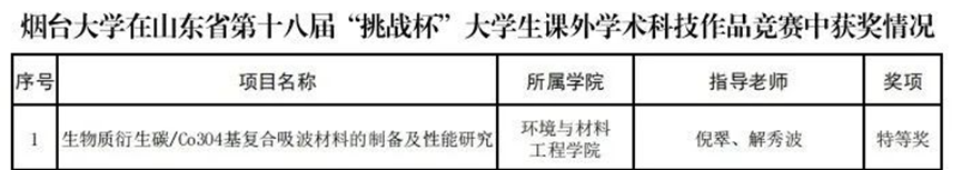 倪翠、解秀波老师指导,秦燕婷、祁玉鹏、于学雨、马业坤、张玉涵等同学参与的项目《生物质衍生碳/Co3O4基复合吸波材料的制备及性能研究》取得了省赛特等奖,并获得参加国赛的资格,实现了我院在该项赛事重大突破。
