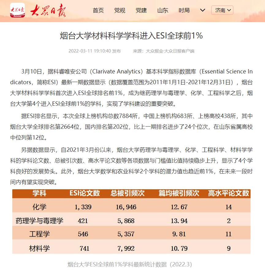 “材料科学”学科进入ESI全球前1%