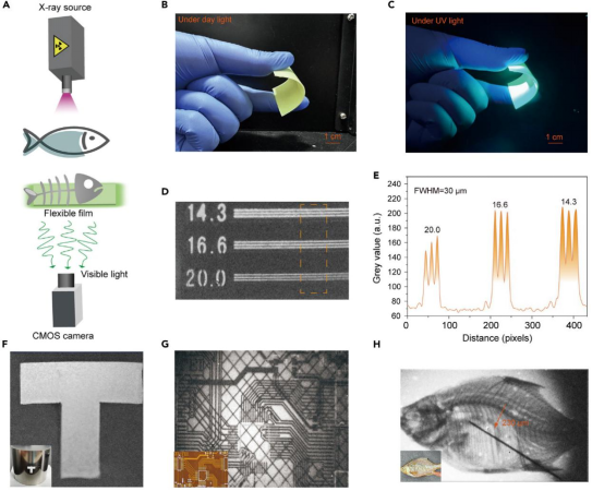通过温和的水热法构建出的聚集诱导(AIE)金属-有机凝胶闪烁体材料,实现了95.5%的高量子效率和44 nGy s-1的极低辐射检测限。基于金属-有机凝胶制备的柔性闪烁膜实现的X射线空间成像分辨率达到20 lp mm-1,为无机和有机样品提供了高分辨率成像的能力。