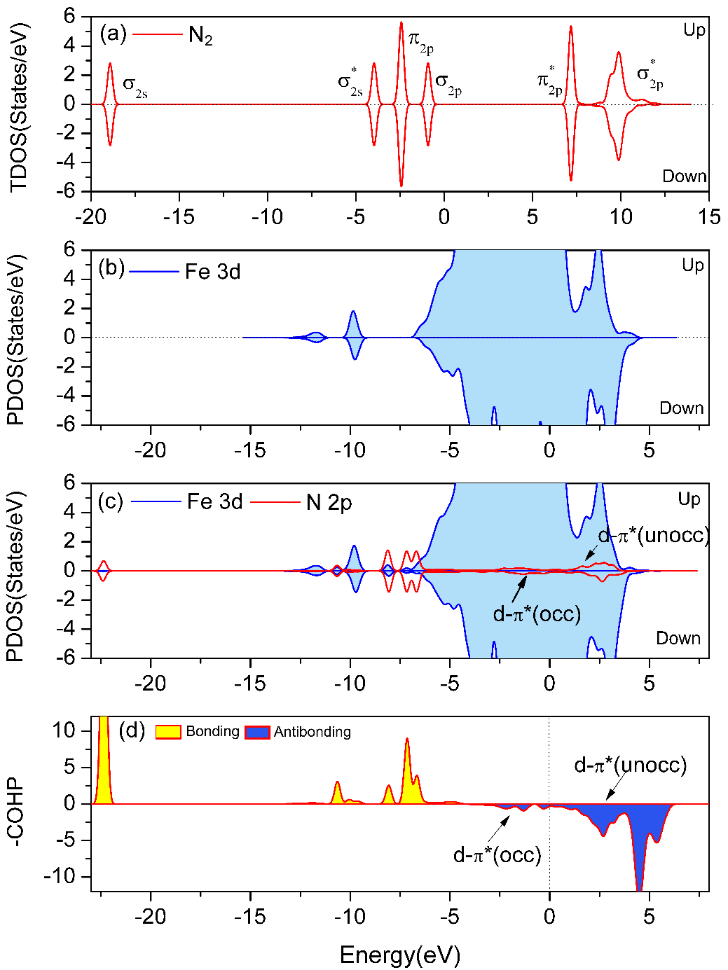 图2,(a) 自由N2分子轨道;(b) 含Te缺陷二维铁磁材料Fe3GeTe2的Fe 3d轨道投影态密度;含Te缺陷二维铁磁材料Fe3GeTe2吸附N2分子构型中的Fe 3d和N 2p轨道投影态密度 (c),及N-N键的Crystal Orbital Hamilton Population (COHP) (d)。按照惯例,-COHP的数值为正表示成键,为负表示反键。