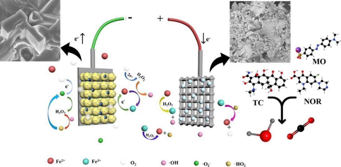 高常飞副教授课题组在Separation and Purification Technology 上发表了题为“Improved degradation of tetracycline, norfloxacin and methyl orange wastewater treatment with dual catalytic electrode assisted self-sustained Fe2+ electro-Fenton system: regulatory factors, mechanisms and pathways”的研究论文,在这项研究中,采用钛网作为基底的PbO2/SnO2阳极和不锈钢作为基底的Ag@ZOF阴极,并在溶液中引入牺牲铁阳极,实现了Fe2+的内源供应和有机废水的高效去除。通过SEM、XRD、XPS以及电化学分析等手段证明了催化剂的成功复合和电极优异的电化学性能。结果表明,在pH范围3.5-4.0、铁面积10 cm2、电流强度9 mA的优化条件下,该工艺能够自支撑产生H2O2和Fe2+,电流效率经计算高达92.37%。对四环素、诺氟沙星、甲基橙均有较好的降解效果,降解效率分别为99.1%、92.8%和100%。