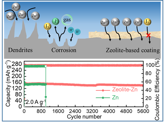 康利涛副教授联合姜付义教授与上海硅酸盐研究所刘建军研究员,提出了一种利用沸石保护层全面提升锌碘电池性能的创新策略。该策略巧妙利用了沸石材料优异的阳离子交换性和分子筛特性,在保障锌离子传输和电池高功率充放电的同时,有效抑制溶剂水分子和氧化性I3-离子对负极的腐蚀与钝化,将电池循环寿命提升5倍,自放速度降低3倍。该策略采用廉价绿色和可规模化扩展的工艺方法,显著提升了锌碘电池的性能效果,为相关研究提供了创新思路。该研究成果近期以“Boosting Zn||I2 battery’s performance by coating a zeolite-based cation-exchange protecting layer”为题发表在Nano Micro Letters上(高水平国产期刊,Justsciece网站即时影响因子22.37)。